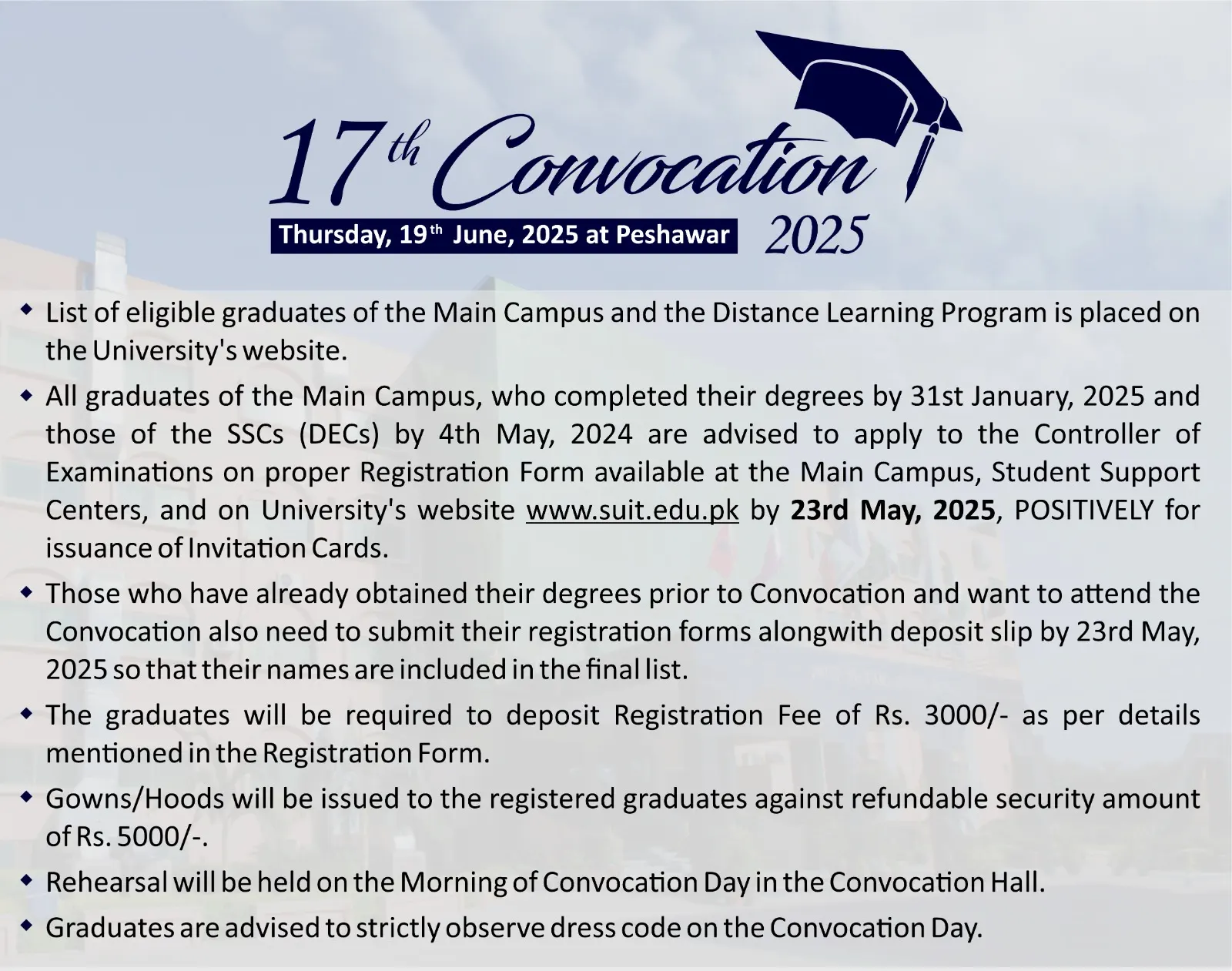 Since its inception, the University has proudly organized sixteen convocations, each marking a significant milestone in the academic journey of our graduates. These prestigious events have been graced by esteemed dignitaries, including the then Governors of Khyber Pakhtunkhwa, as well as the Prime Minister and Presidents of the Islamic Republic of Pakistan, making them truly memorable occasions in our institution’s history.